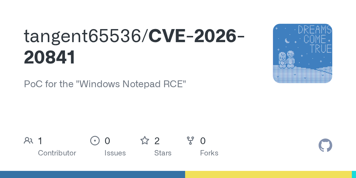 A working proof-of-concept exploit for CVE-2026-20841 — the Windows Notepad remote code execution vulnerability patched in February — appeared on GitHub today. The window between PoC publication and active phishing campaigns is typically days.