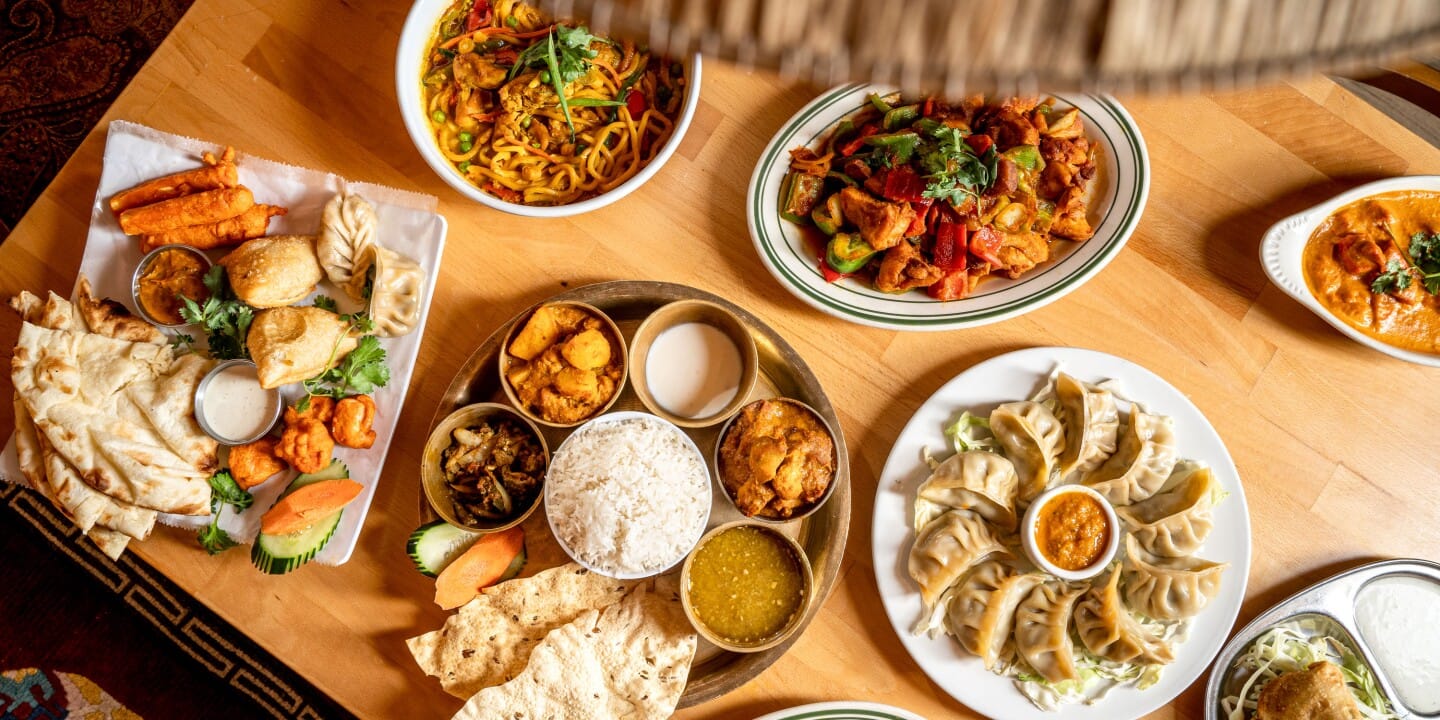 The food they've brought deserves understanding on its own terms — not as a subset of Indian or Nepali cuisine. Dal bhat, the lentil-and-rice backbone of Himalayan life, is built for endurance: eaten by farmers, porters, and trekkers who need sustained energy for a full day. Alongside it: momos (steamed dumplings tracing to Tibetan traders in the Kathmandu Valley), yak curries, and Sherpa-style chow mein carried by Tibetans who settled in Nepal.